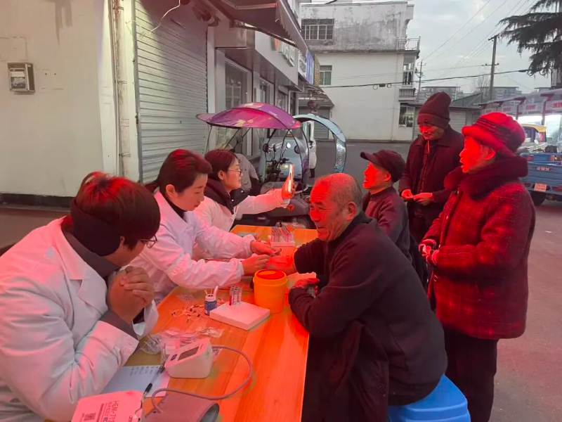 与此同时,村委会工作人员一早就布置好就诊及检测桌椅板凳宣传单页电源,同时来自新潭镇卫生院的医护团队陆续进入诊断工位,带着专业医疗设备为村民提供全方位义诊服务。医护人员耐心细致地为每一位村民测量血压、细致采集血样,开展血糖检测,认真记录各项健康数据。针对村民提出的慢性病防治、日常保健、用药指导等疑问,医护人员结合检测结果逐一进行专业解答,量身定制个性化健康指导建议,用专业素养和贴心服务打消村民的健康顾虑。