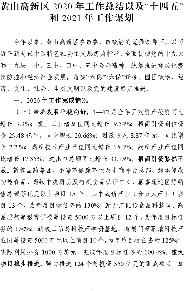 黄山高新区2020年工作总结以及“十四五”和2021年工作谋划