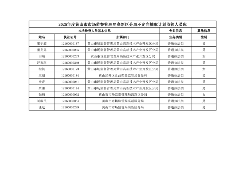 【监管人员库】2025年度黄山市市场监督管理局高新区分局不定向抽取计划监管人员库