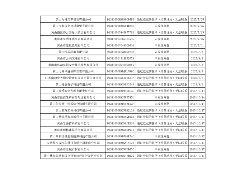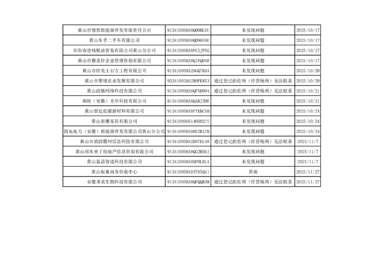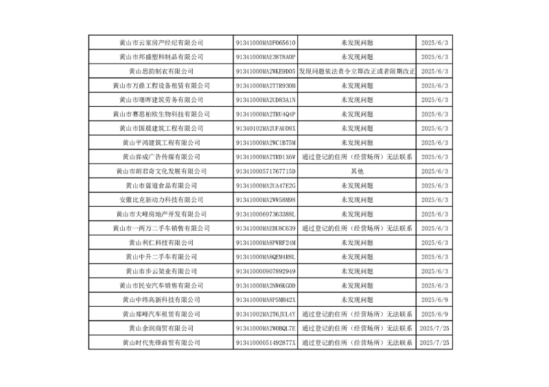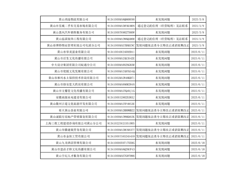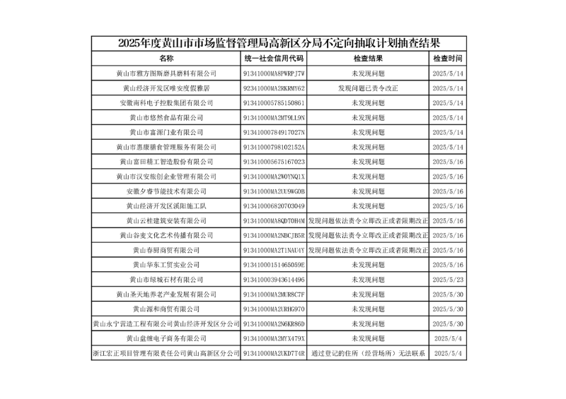 2025年度黄山市市场监督管理局高新区分局不定向抽取计划抽查结果