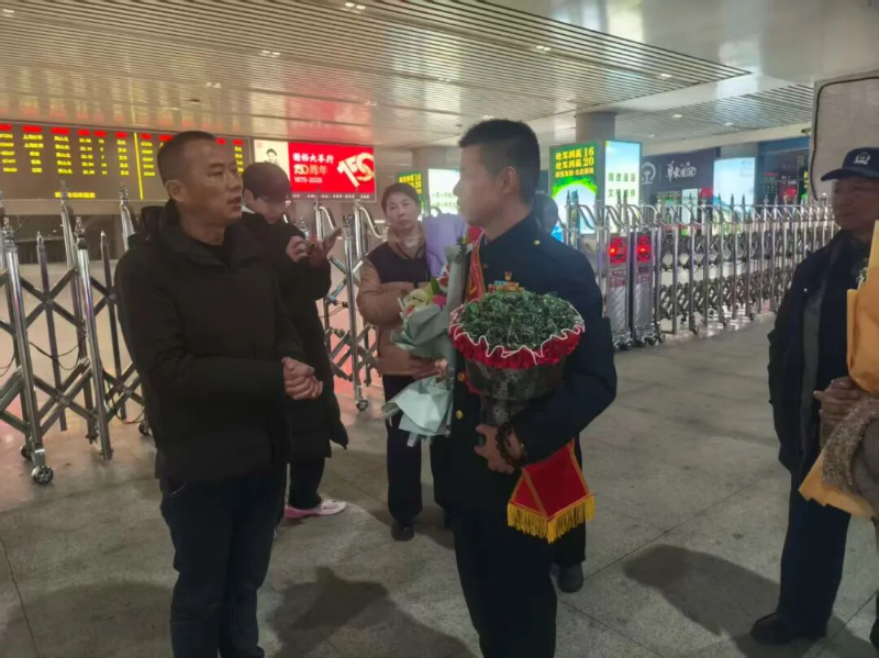 12月1日晚,黄山北站出站口温情洋溢。新潭镇退役军人事务站、竹林村退役军人服务站工作人员与竹林村党总支书记、村主任江雪巧,共同陪伴着老兵家属,手持鲜花、拉起横幅,静静等候一位特殊的归乡人——在部队服役16年的竹林村惠门籍退役军人方国强。