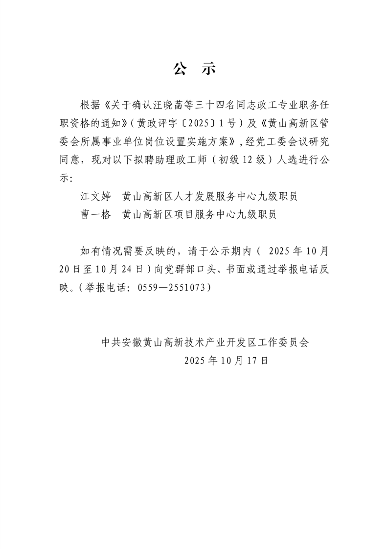 黄山高新区所属事业单位政工岗拟聘用人员公示
