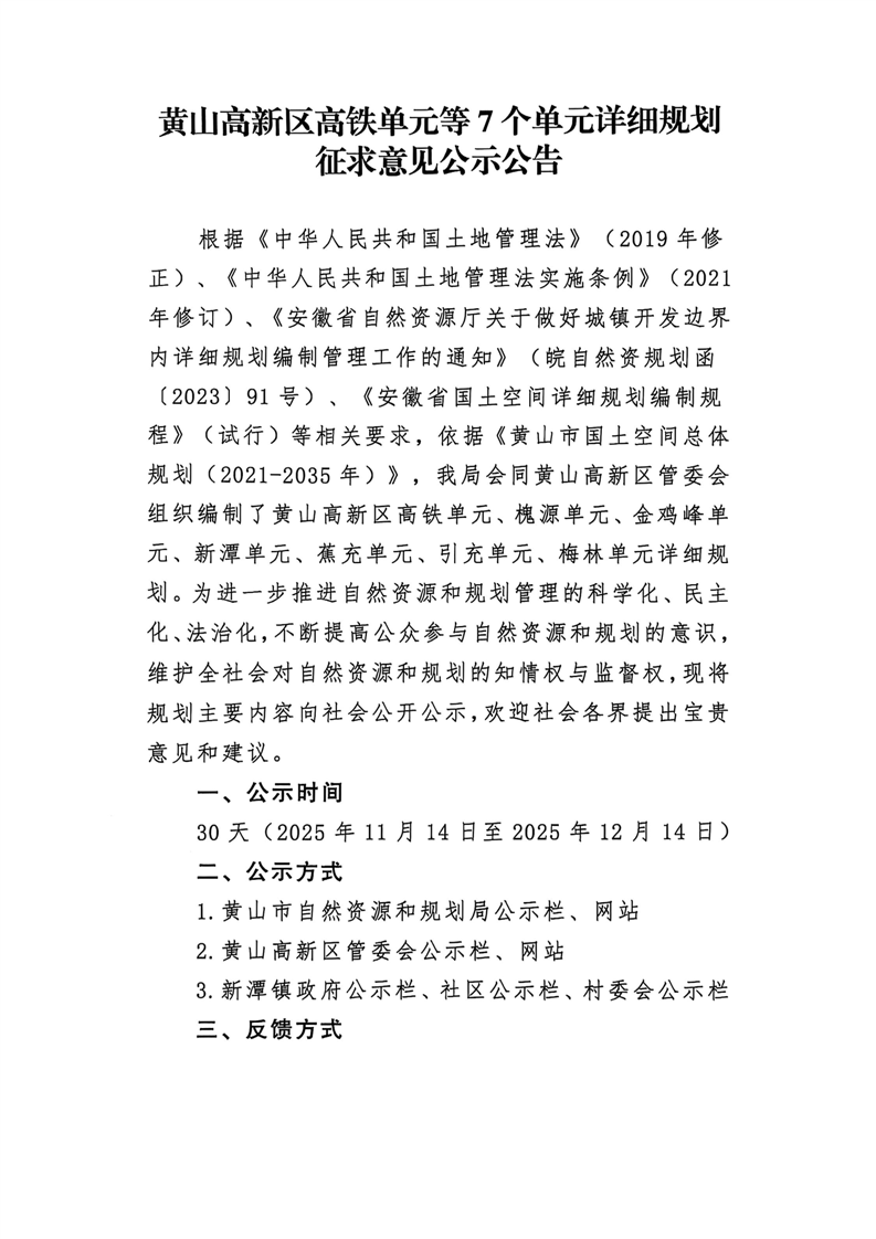 黄山高新区高铁单元等7个单元详细规划征求意见公示公告