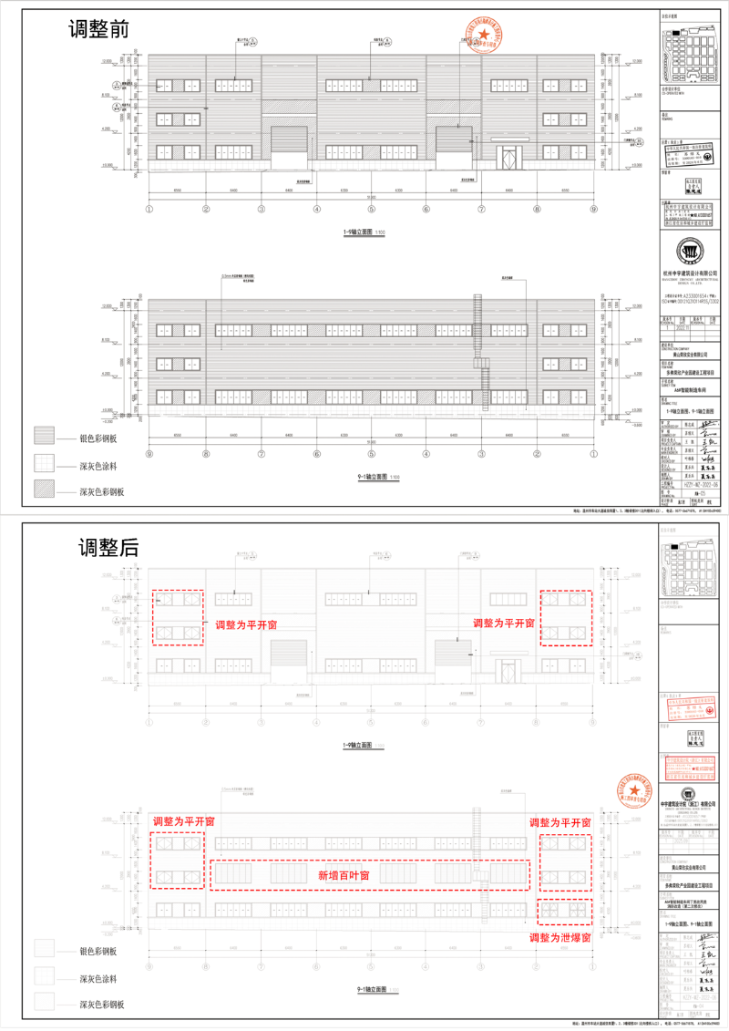 6、9-1轴立面图(北侧立面)二三层9-8轴及2-1轴推拉窗调整为平开窗、一层2-1轴推拉窗调整为泄爆窗(具体详见附图)。