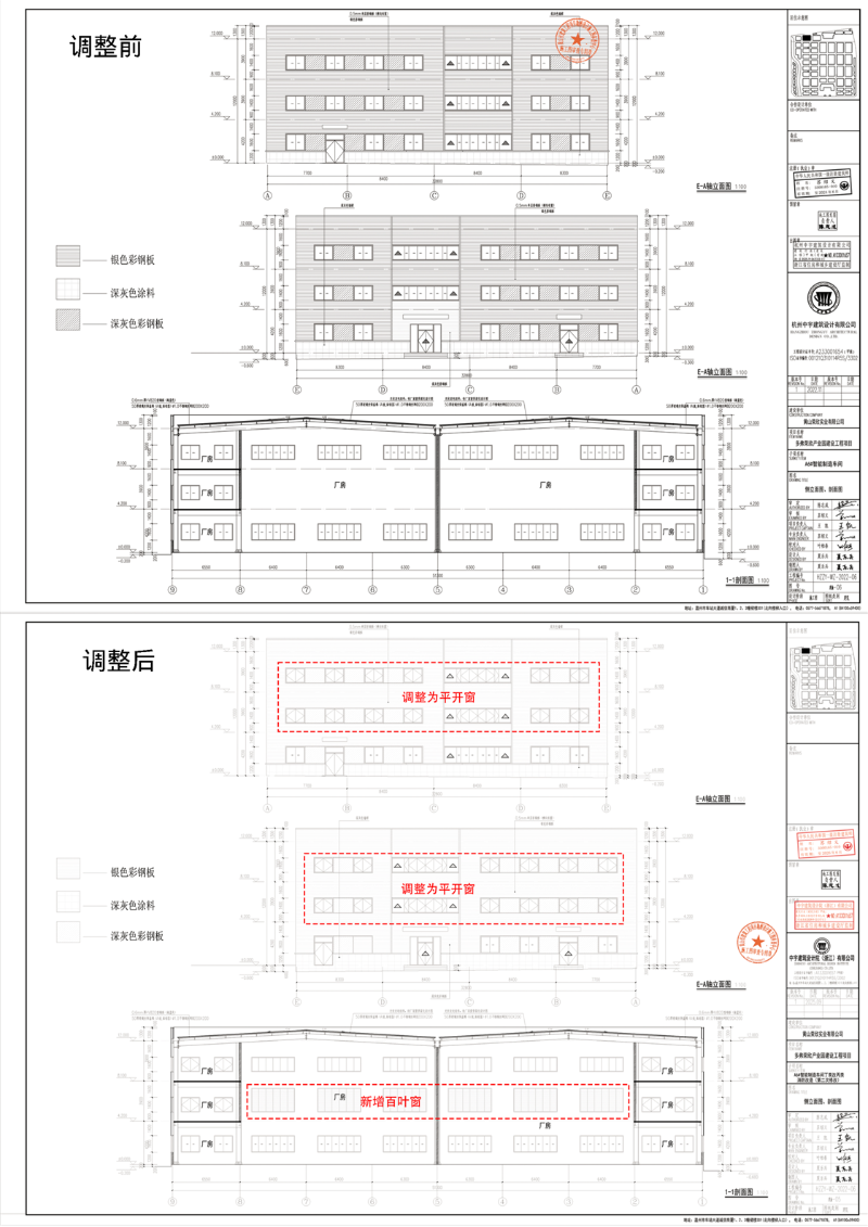 8、E-A轴立面图(西侧立面)、A-E轴立面图(东侧立面)二三层推拉窗调整为平开窗(具体详见附图)。