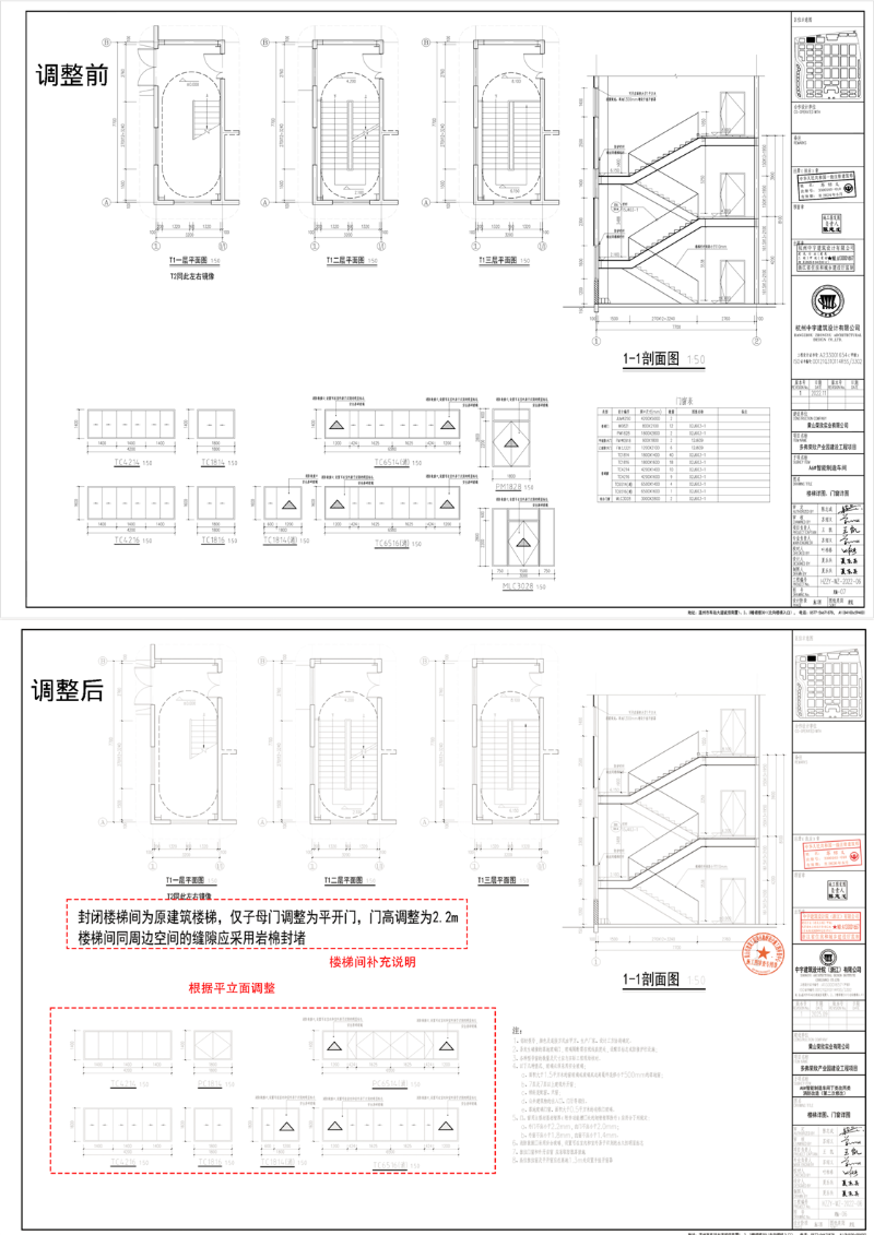 9、所有开向楼梯间疏散门由子母乙级防火门调整为平开乙级防火门,门高调整为2.2m(具体详见附图)。