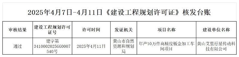 2025年4月7日-4月11日《建设工程规划许可证》核发台账